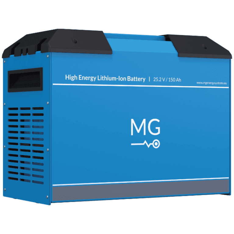 De MG HE-accu 25,2V/150Ah/3750Wh is gebaseerd op Lithium-Ion NMC technologie. Systeemflexibiliteit van het is een van de belangrijkste kenmerken van alle MG-producten. Door HE-batterijen te combineren met een van de masterunits ontstaat een krachtig systeem voor een compleet scala aan toepassingen met een systeemspanning van 25,5 V tot 144 V en een vermogen van 2,5 kWh tot 720 kWh
