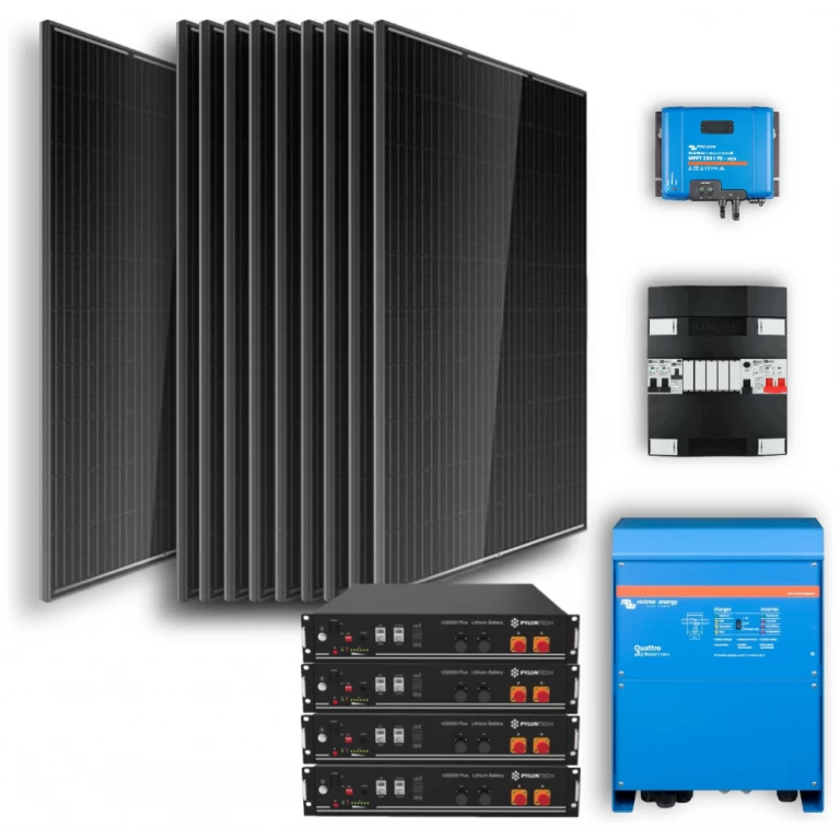 De omvormer bij deze set is een Victron Quattro 48/8000/110-100/100. De Quattro levert 8000W continu aan je apparaten. Het piekvermogen is 16000W. Op minder zonnige dagen sluit je je aggregaat aan op de Quattro om eenvoudig je accu’s bij te laden.